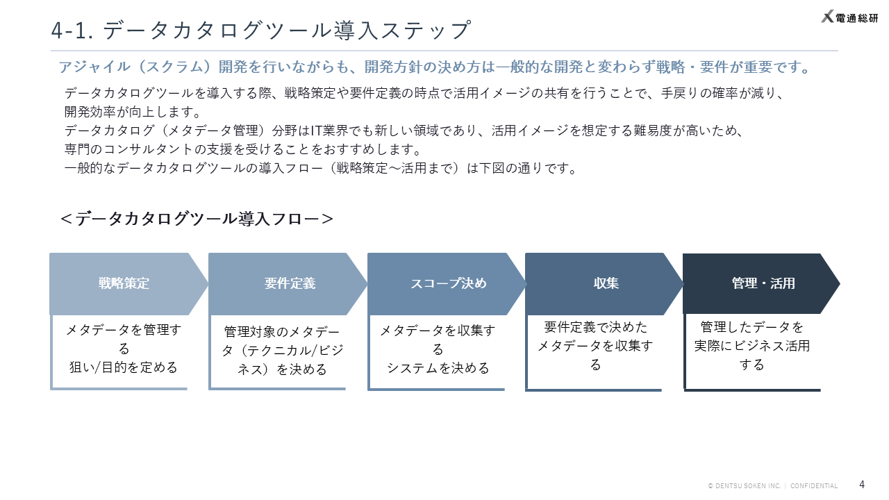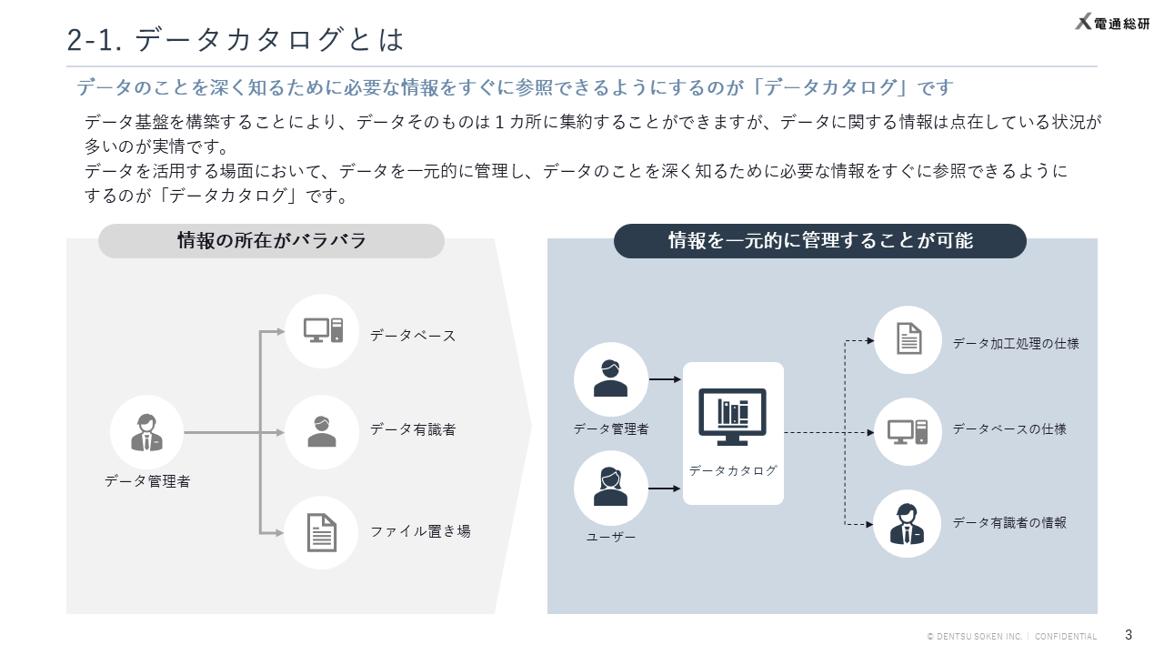 「メタデータ」と「データカタログ」の概要/メリット/活用のポイント/活用例に加え、データカタログツールの主要な機能/導入ステップなどをわかりやすく解説します。