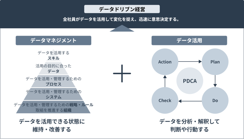 データドリブン経営を実現させるには”データ活用”だけでなく ”データマネジメント”が必要になります。データマネジメントは、”データを活用できる状態に維持・改善する活動”です。データマネジメントされていないとデータの品質不足などでデータ活用で効果を得ることは難しくなります。データ活用を継続的に支え、改善していくためには、組織全体でデータを整備して管理・運用してデータの価値を引き出すデータマネジメントが重要であると、私たちは考えています。