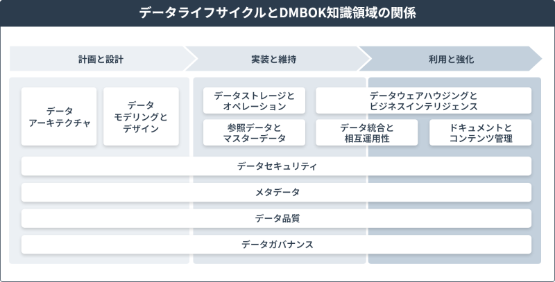データ活用・データマネジメントコンサルティングサービスではDMBOKの知識体系をベースにこれまでの支援を通じて得られた知見を組み合わせ、データ戦略の策定から、データ基盤構築と並行して、データ戦略実現に向けたデータマネジメント体制整備、データ活用推進支援(事例創出)、教育・コミュニティ運営と構想段階から実行段階まで包括的に支援します。