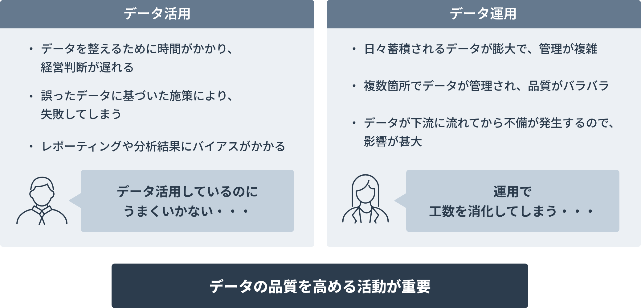 根本的な解決には、部門を超えてデータの生成から活用までを俯瞰して継続的に品質を維持向上させるデータマネジメントの活動が必要です。