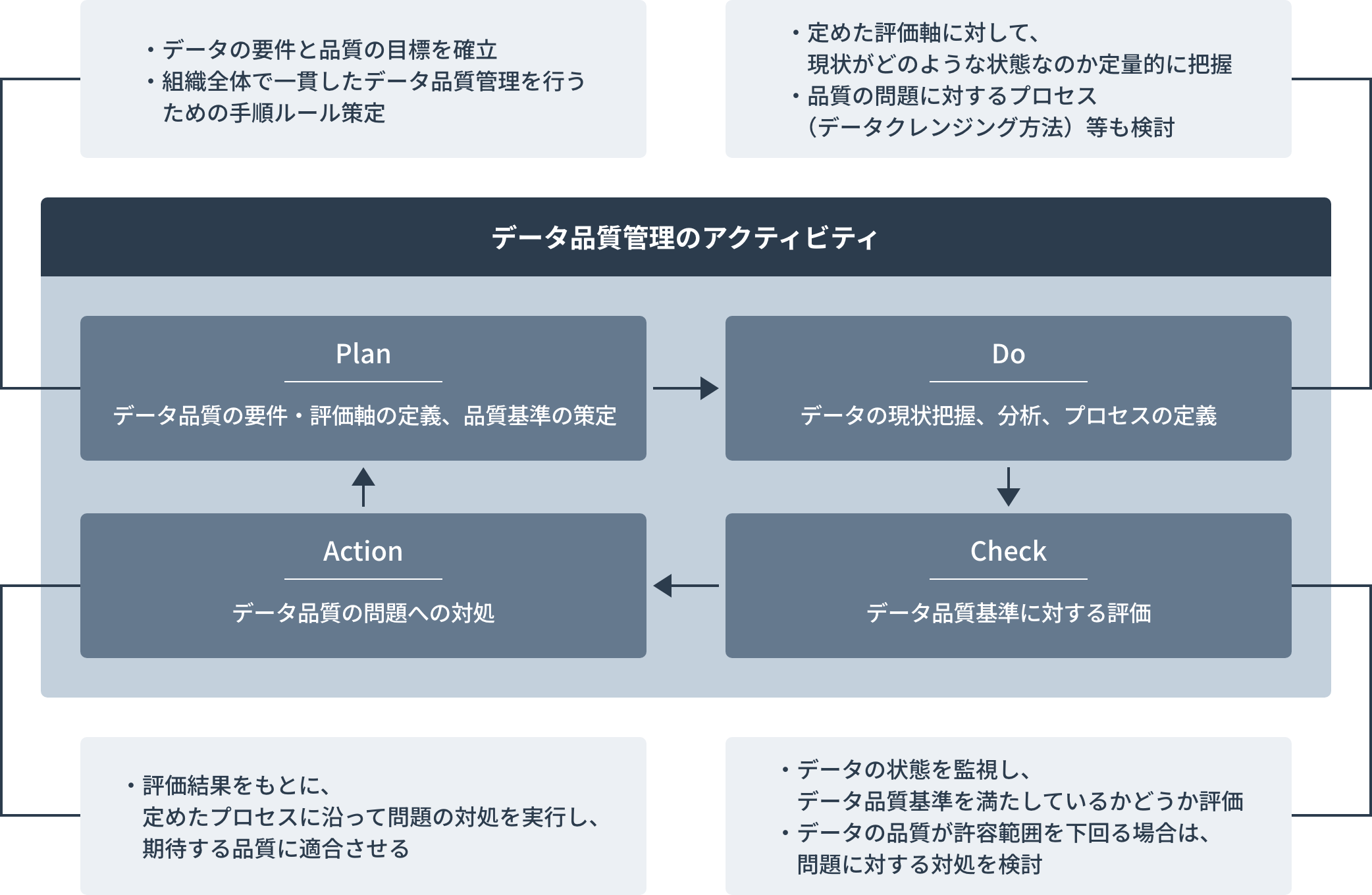 データ品質管理は、利用者のニーズに適したデータとすることを保証する活動を計画し、実施し、管理する活動です。適切なデータ品質管理を継続することで、誤ったデータの使用を未然に防ぎ、基盤運用業務の効率化や分析精度の向上を実現します。