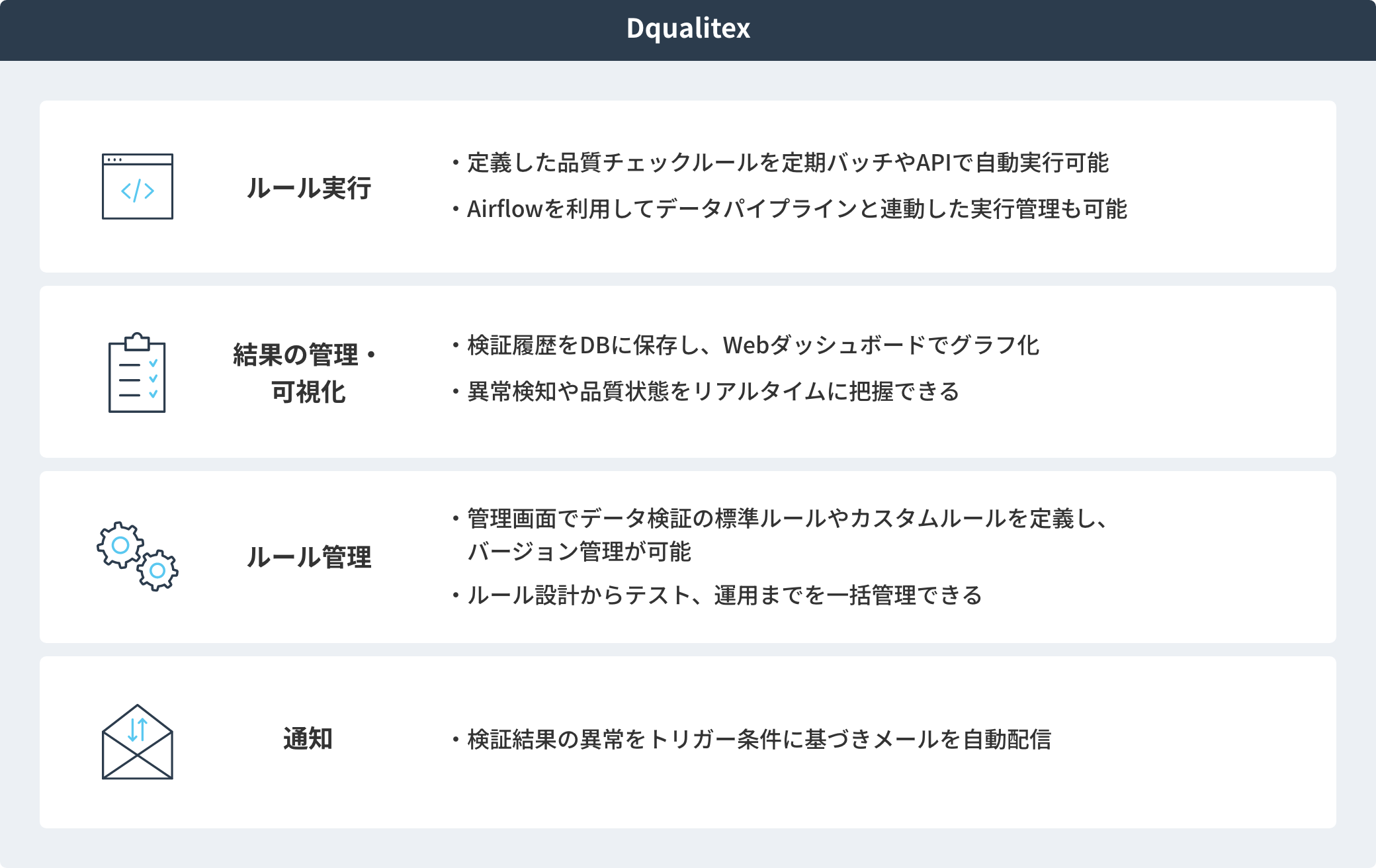「Dqualitex」は、データ品質管理アクティビティのうち“Do”と“Check”を実行するためのツールです。複数のデータ活用/分析基盤に対し組織のデータ基準で評価の定義を行い、データの評価とその結果を確認することが出来ます。