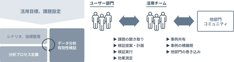 データ活用を社内に広げるには、現場で活用を推進する「活用チーム」の存在が欠かせません。活用チームは、業務課題に寄り添いながら、最新ツールを駆使してデータの可視化・分析を行い、有効性を検証します。こうした事例の創出により、ユーザー部門の理解と参加が進み、データ活用が自然と広がっていきます。