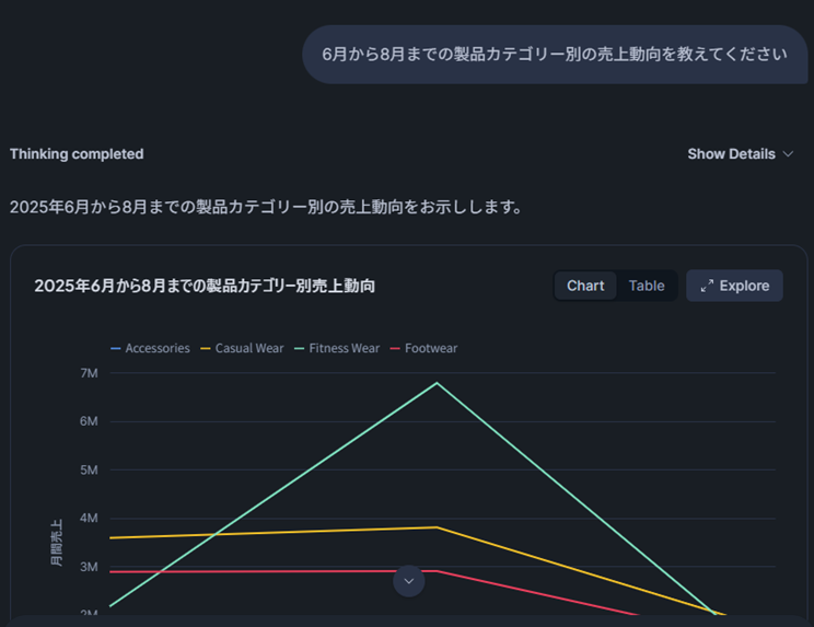 Snowflake Intelligenceには専用のUIが用意されていますので、そちらからチャットベースで問い合わせることで該当データに対する結果やグラフの出力が行われます。