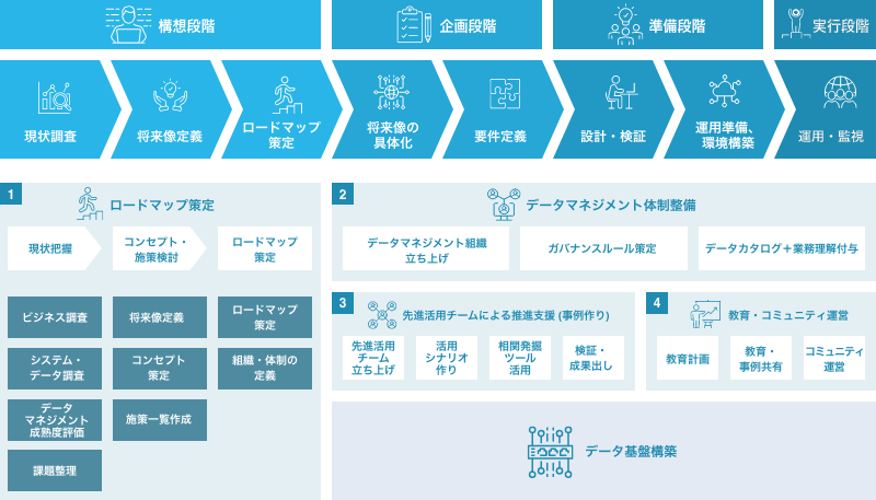 「データ基盤は構築したものの、利用範囲が限定的で、この先の広がりが見えない」という状況に陥らないためには、データ分析基盤の構築に先んじて、ロードマップを策定し、段階的に活用を推進していくことが重要です。