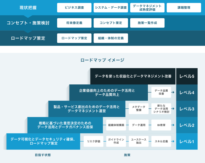 電通総研のデータマネジメントコンサルティングサービスは、まずはじめにお客様の現状を把握し、将来像を定義したうえで、その実現に向けたロードマップ策定をご支援します。