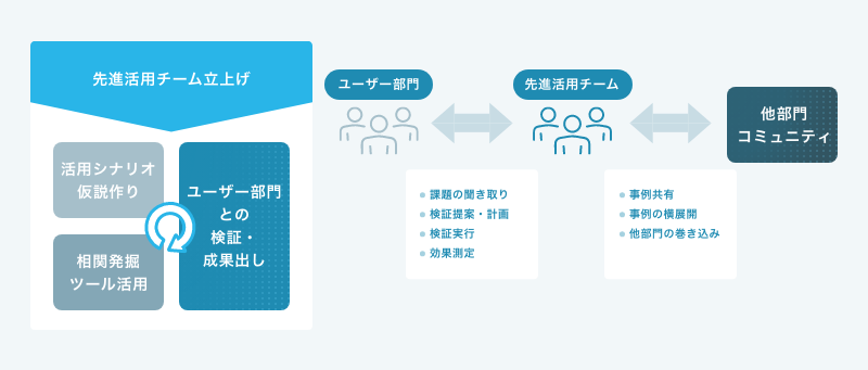 データの品質を確保してくれるマネジメント組織に加え、現場のデータ活用を計画・推進するチームも立ち上げましょう。先進活用チームが、最新のツールを駆使しながら、先陣を切ってデータ活用の効果を検証し、ユーザー部門を巻き込みながらユースケースを展開することで、データ活用のハードルが下がり、ユーザー部門でも利用が促進されます。