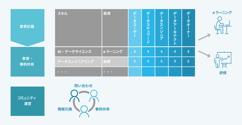 データ活用の成果出しや定着は、息の長い活動です。活動の維持・発展には、教育やコミュニティ運営を通して、社内のデータ活用能力を高め、自律的に活動できる状態とすることが必要となります。