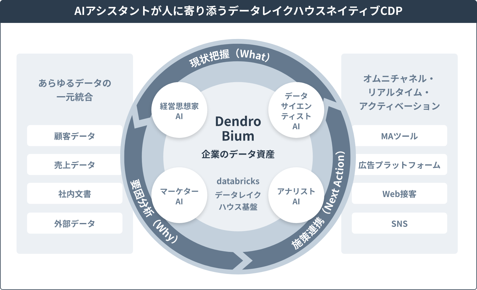 DendroBium(デンドロビウム)は、電通総研が培ってきたCDP構築やマーケティング基盤の実績に、Webアプリ開発力とマーケティング知見を融合して開発したデータレイクハウスネイティブCDPです。基盤には「Databricks」を採用し、データレイクの柔軟性とデータウェアハウスの信頼性を両立。構造化・半構造化・非構造化データを一元管理し、BI・AI・生成AIなどの多様な分析処理を単一プラットフォームで実行できます。企業ごとの事業特性や目的に応じて柔軟に構成できるコンポーザブルCDPとして、リアルタイムかつオムニチャネルでのデータ活用と、高度な意思決定を支援します。