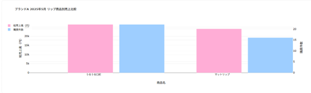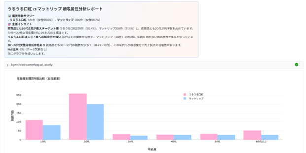 作成したエージェントを用いて特定期間内のリップ商品の売上の比較を依頼したところ、しっかりと商品ごとの総売上高やインサイトをグラフを用いてレポート化してくれました。