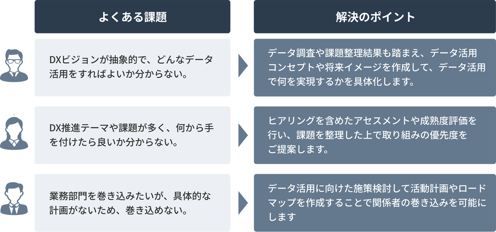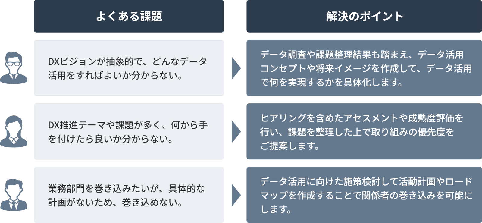 現状把握から将来像の作成、ロードマップ策定まで、データ活用のゴールまでの着実な道筋を提示