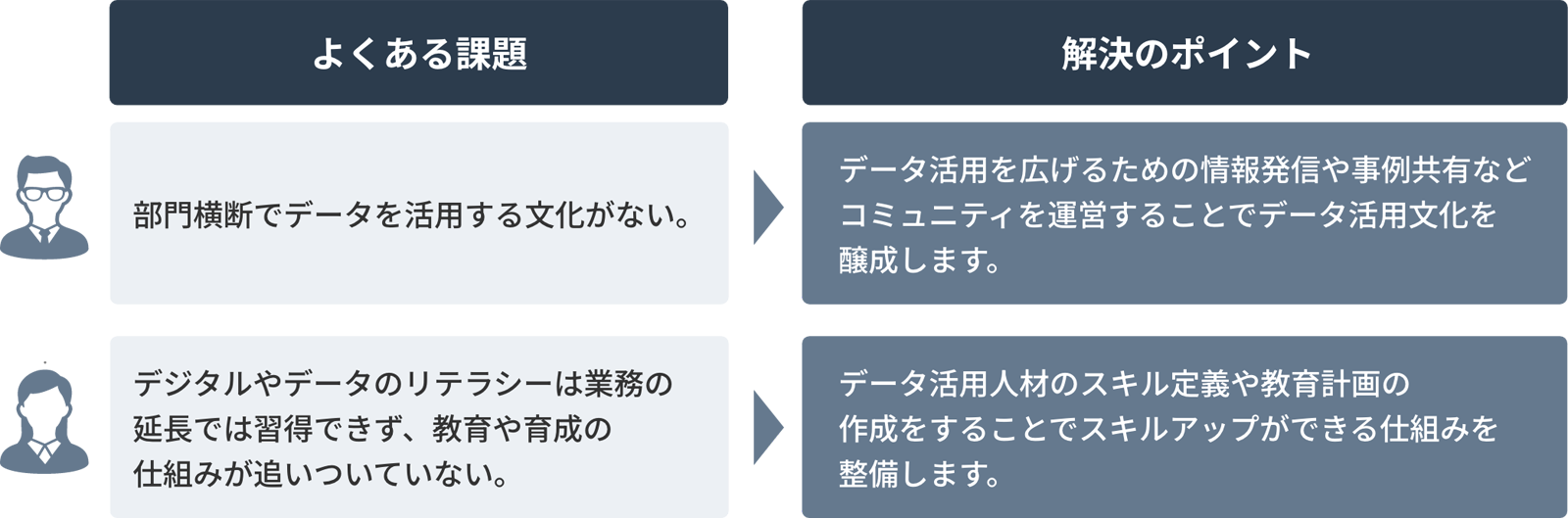 データ活用の定着まで教育プログラムの提供や伴走支援が可能なため、自律的なデータ活用の実現までの支援が可能です。