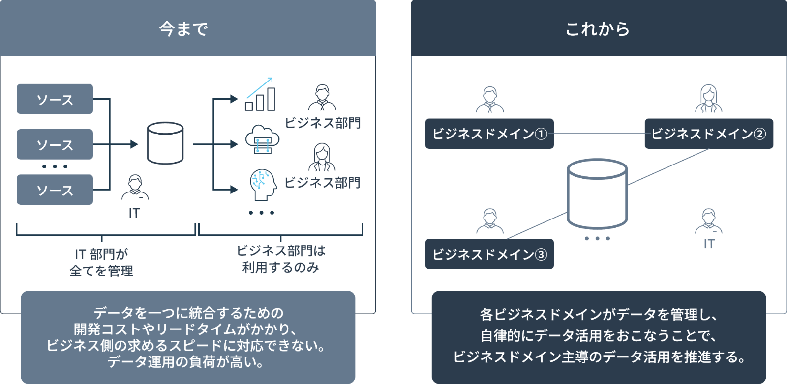 各ビジネスドメインごとにデータプラットフォームを構築し、データやプラットフォームの管理はビジネスドメインが主導しておこないます。