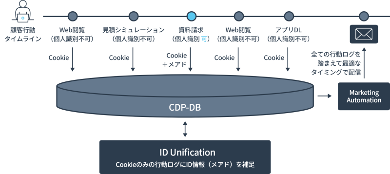 個人識別不可の状態でのWeb・アプリ行動ログもCDPのタグ機能で直接取得しつつ、後追いで個人特定可能なID情報と紐づけられるようなデータ設計を行うことで、取得できる情報が限定的なリード顧客についても、あらゆる行動ログに基づく精度の高いセグメンテーション・スコアリングが実現可能になります。これらの情報をMarketing Automationへ自動連携することで、興味関心に基づくタイムリーかつパーソナライズされたコンテンツでのメッセージ配信を行うことができ、効果的なリードナーチャリングに繋がります。