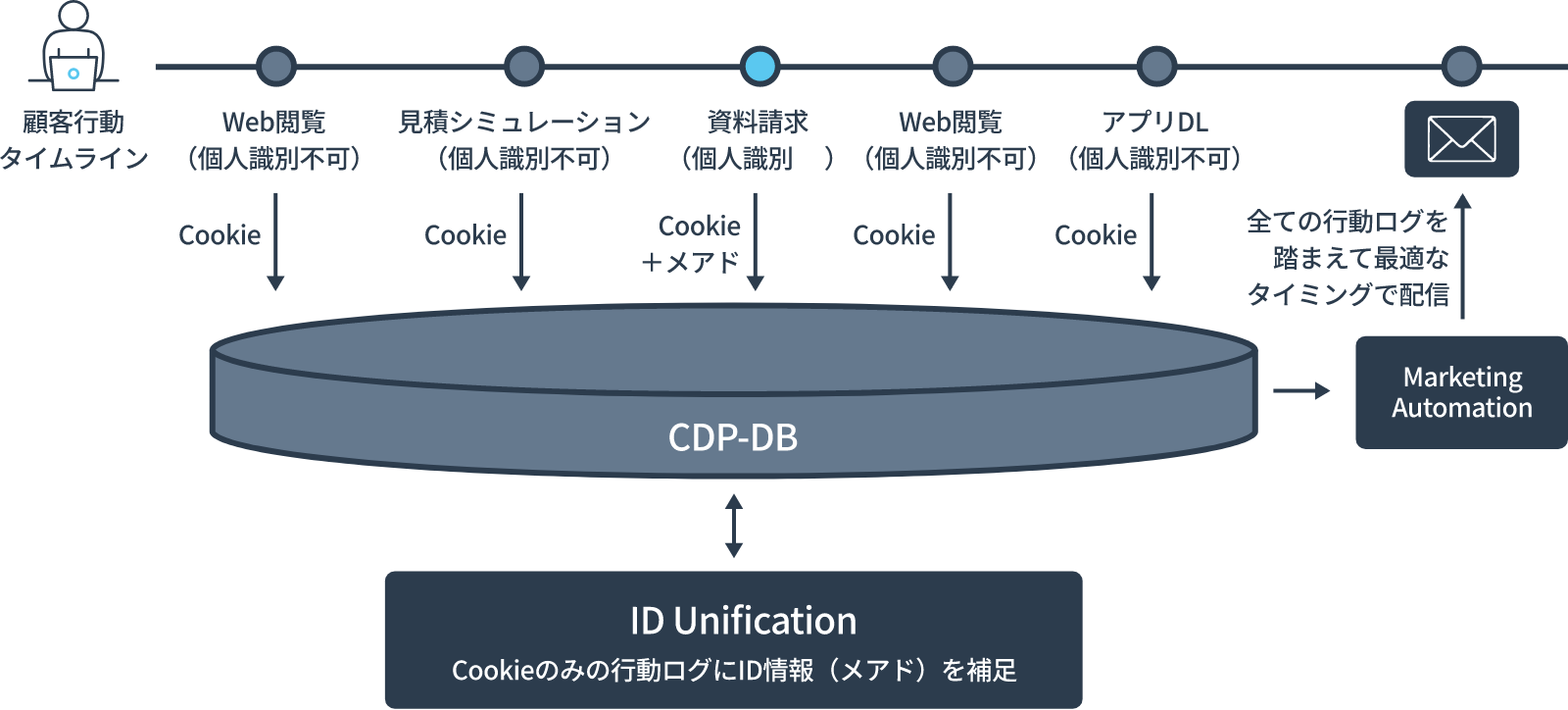 個人識別不可の状態でのWeb・アプリ行動ログもCDPのタグ機能で直接取得しつつ、後追いで個人特定可能なID情報と紐づけられるようなデータ設計を行うことで、取得できる情報が限定的なリード顧客についても、あらゆる行動ログに基づく精度の高いセグメンテーション・スコアリングが実現可能になります。これらの情報をMarketing Automationへ自動連携することで、興味関心に基づくタイムリーかつパーソナライズされたコンテンツでのメッセージ配信を行うことができ、効果的なリードナーチャリングに繋がります。