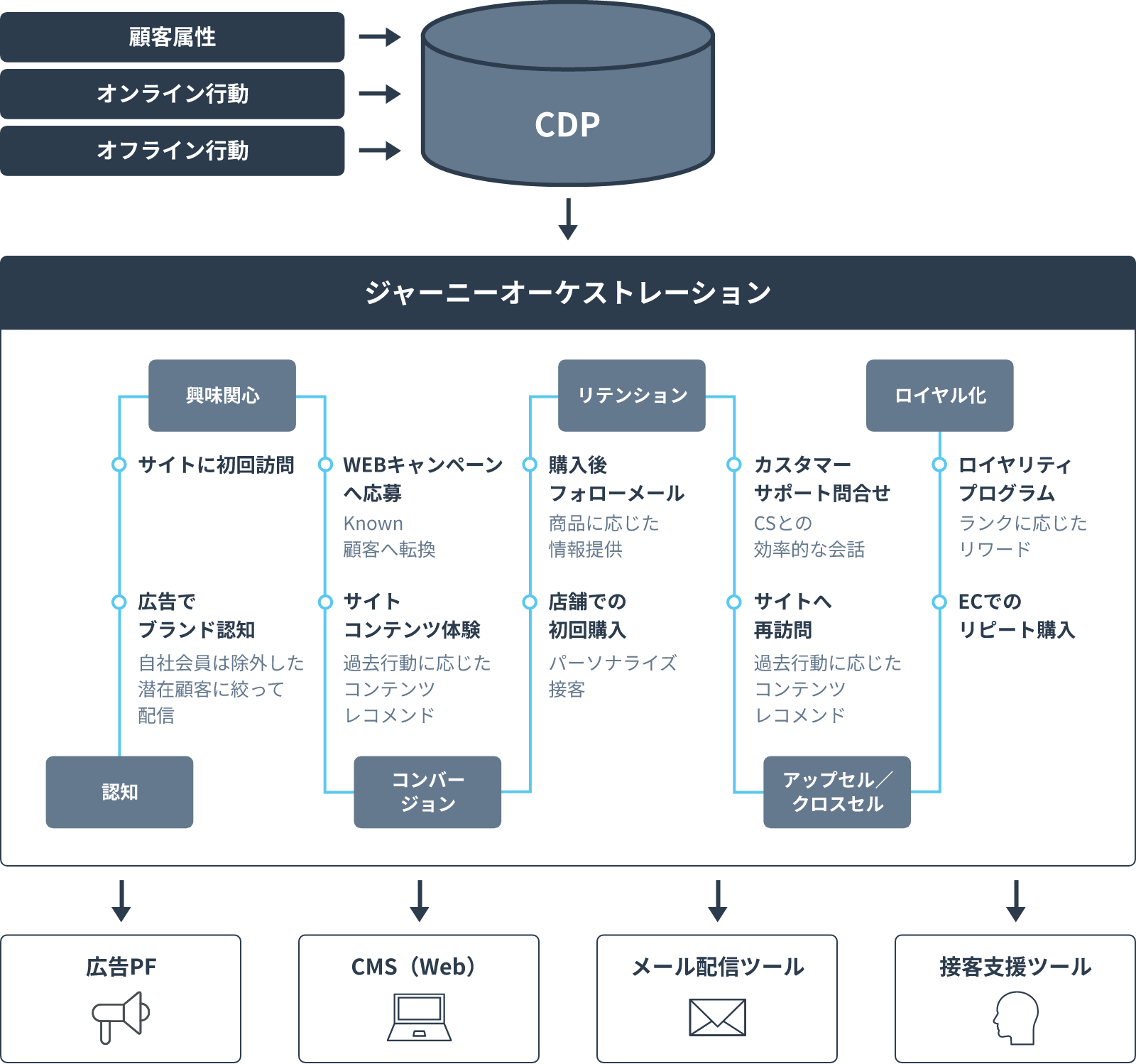 CDPはあらゆるデータソースやアクティベーション先の施策実行ツールとシームレスに接続できる豊富なコネクタを持っています。このような機能を保持するCDPが、オンライン/オフラインの顧客データの統合から、あらゆるチャネルでのジャーニーをオーケストレーションする役割を担うことで、チャネル横断での一貫した顧客体験を提供します。また、施策結果を再度CDPにフィードバックすることで、継続的な精度向上を実現します。