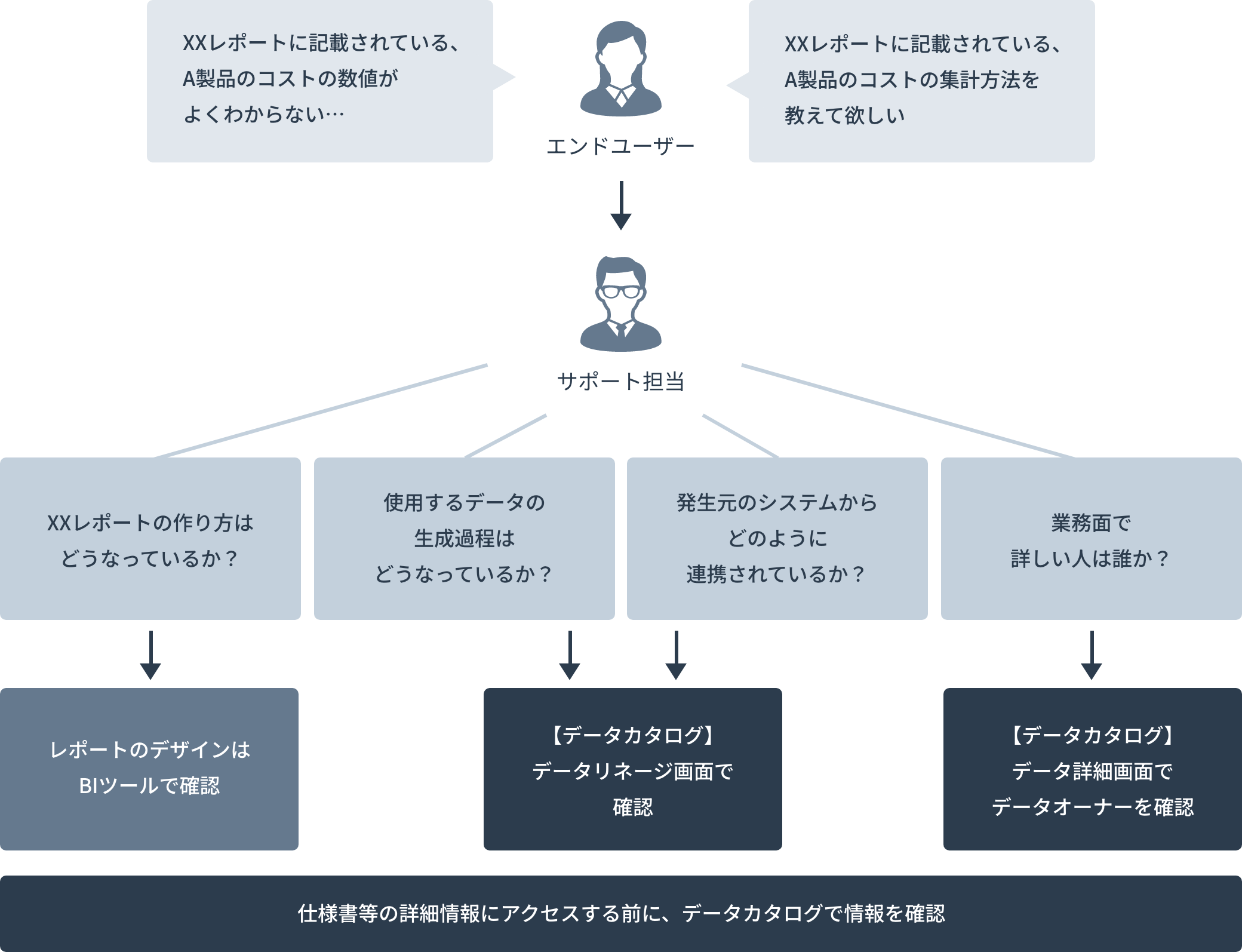 データカタログを導入することで、サポート担当やエンドユーザーはBIツールやDWHに関するメタ情報を参照でき、エンドユーザー自身で解決したり、仕様書などの詳細情報を調査することなく、ユーザーのサポートが可能となります。