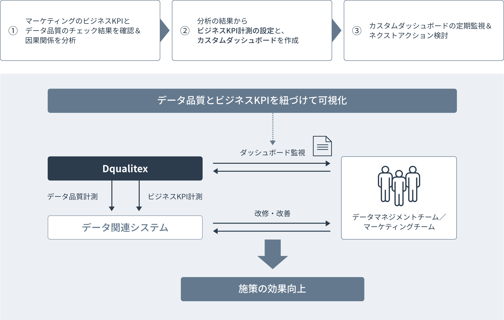 Dqualitexを導入し、データ品質のチェック結果からビジネスKPI計測の設定と、標準ダッシュボードをカスタマイズすることによって 施策の“課題の早期発見・高速 PDCA・ROI 向上”を実現することが出来ます。